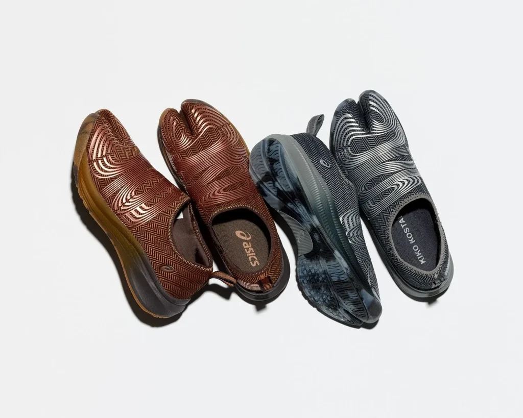 Taking a more conceptual approach, Kiko Kostadinov’s ongoing work with Asics reframes the tabi through performance design. The Lyasa FF Tabi draws from archival ASICS marathon shoes from the 1970s and is reinterpreted through a sleek slip-on silhouette that prioritises lightness and flexibility. Constructed with a soft elastic upper and minimal seams, it offers a close, sock-like fit. Rather than emphasising the split visually, the design integrates it into a fluid, sculptural form, making the tabi feel like a natural extension of the shoe.