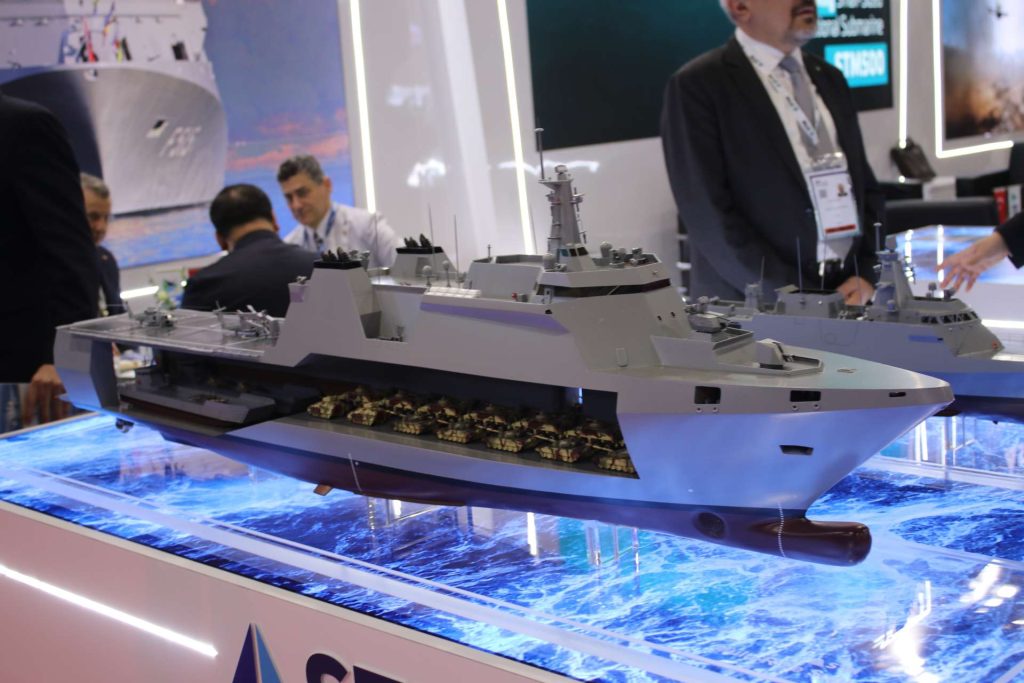 The ship sits in the medium amphibious class: 153.2 meters long, 24 meters wide, about 9,700 tons displacement, 18+ knots top speed, 8,000+ nautical miles of range at 14 knots, and 30 days of endurance. STM says it carries 150 crew plus 500 troops, two LCUs in the well dock, an 800-square-meter tank deck for 14 main battle tanks and nine assault amphibious vehicles, two 15-ton helicopters, and two 10-meter RHIBs.