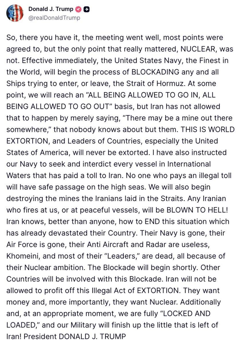 Trump stated that due to Iran’s decision not to accept US demands at the discussions, he had ordered the US Navy to blockade the strait of Hormuz.