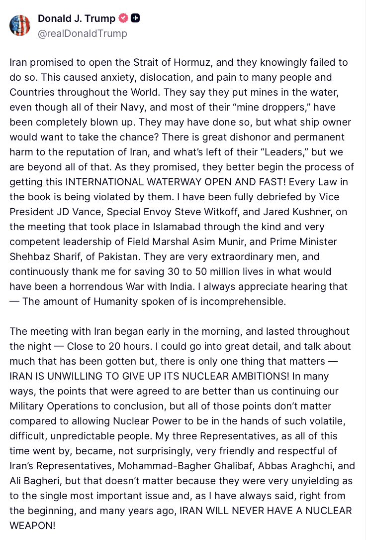 In a post on Truth Social, Trump said Iran had “failed” to reopen the Strait of Hormuz despite assurances during talks and alleged that the situation had caused “anxiety, dislocation, and pain” globally. He claimed the US Navy would begin blocking “any and all ships trying to enter, or leave” the waterway, describing it as an “international waterway” that must be kept open.