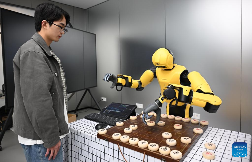 A staff member plays Xiangqi (a traditional Chinese board game also known as the Chinese chess) with a robot at a provincial embodied artificial intelligence (AI) training center in Guangzhou, south China’s Guangdong Province, April 7, 2026. Guangdong Province has taken various measures in recent years to explore the development and application of embodied artificial intelligence (AI). Domestically leading industrial clusters are booming in cities such as Shenzhen and Guangzhou in the province.