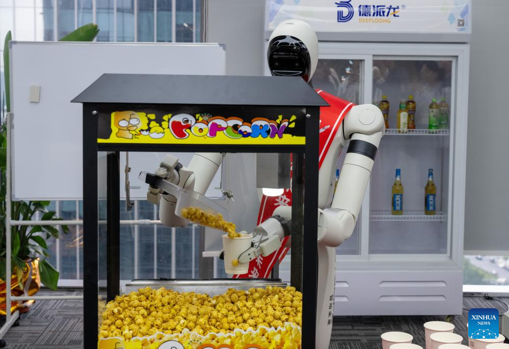 A robot sells pop corns at a company in Guangzhou, south China’s Guangdong Province, March 26, 2026. Guangdong Province has taken various measures in recent years to explore the development and application of embodied artificial intelligence (AI). Domestically leading industrial clusters are booming in cities such as Shenzhen and Guangzhou in the province.