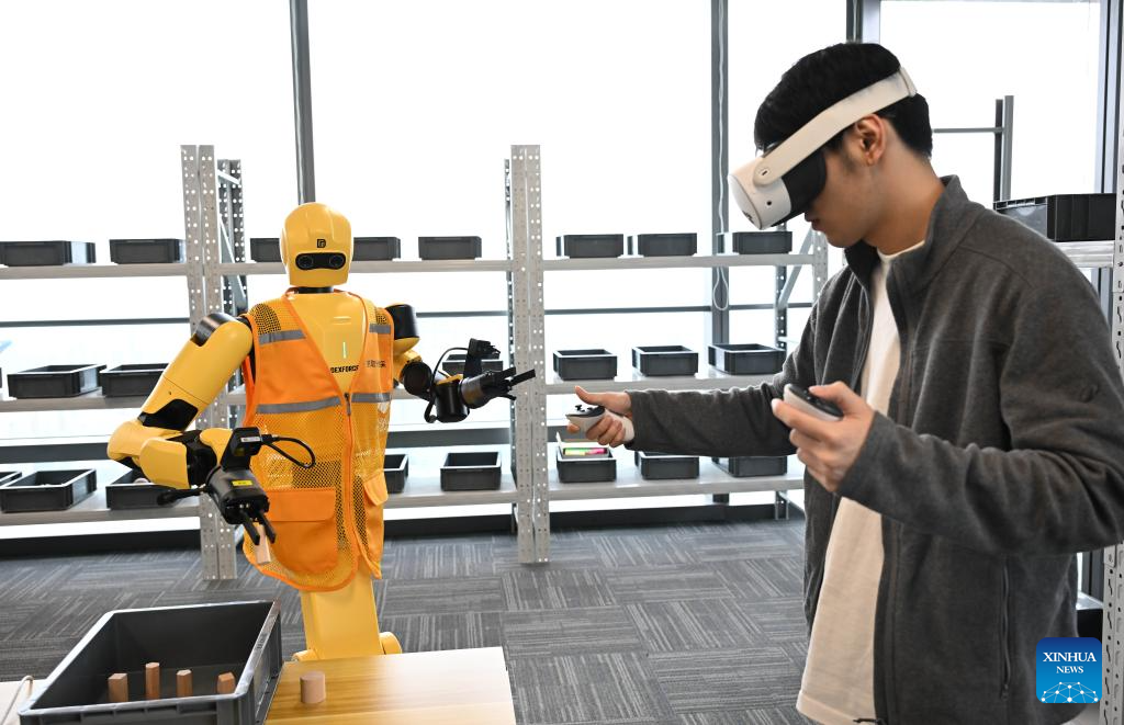 A staff member trains a robot on fetching components in complicated shapes at a provincial embodied artificial intelligence (AI) training center in Guangzhou, south China’s Guangdong Province, April 7, 2026. Guangdong Province has taken various measures in recent years to explore the development and application of embodied artificial intelligence (AI). Domestically leading industrial clusters are booming in cities such as Shenzhen and Guangzhou in the province.