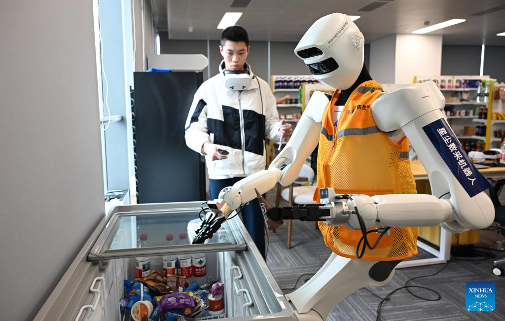A staff member trains a robot on cargo arrangement under a simulated environment at a provincial embodied artificial intelligence (AI) training center in Guangzhou, south China’s Guangdong Province, April 7, 2026. Guangdong Province has taken various measures in recent years to explore the development and application of embodied artificial intelligence (AI). Domestically leading industrial clusters are booming in cities such as Shenzhen and Guangzhou in the province.
