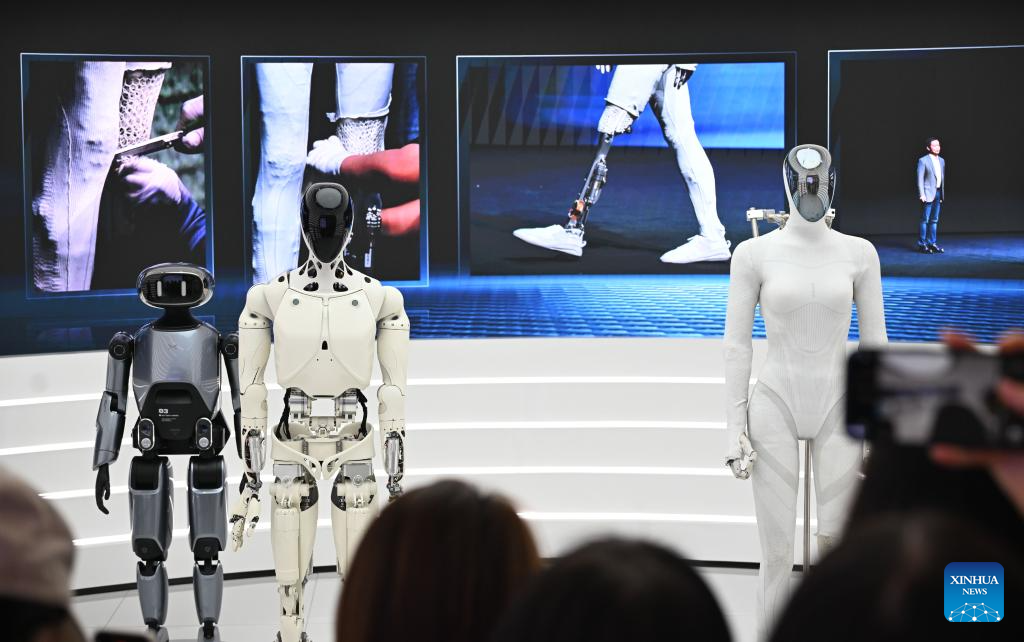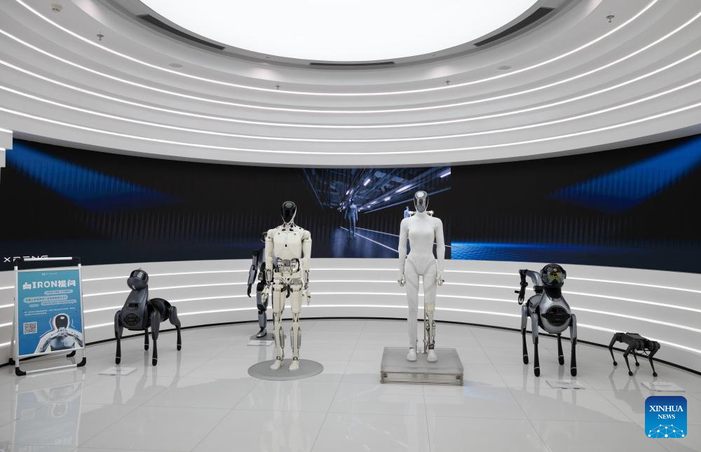 This photo taken on March 27, 2026 shows artificial intelligent robots at the headquarters of Xpeng in Guangzhou, south China’s Guangdong Province. Guangdong Province has taken various measures in recent years to explore the development and application of embodied artificial intelligence (AI). Domestically leading industrial clusters are booming in cities such as Shenzhen and Guangzhou in the province.