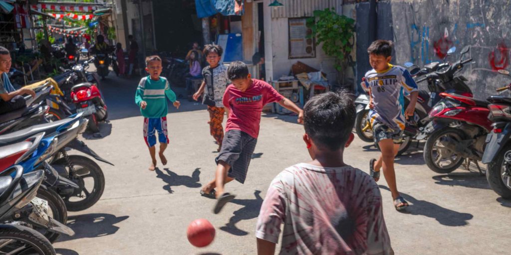 Kids play soccer in an alley in Jakarta. In a city of 42 million people, finding company is rarely a problem. © Getty Images