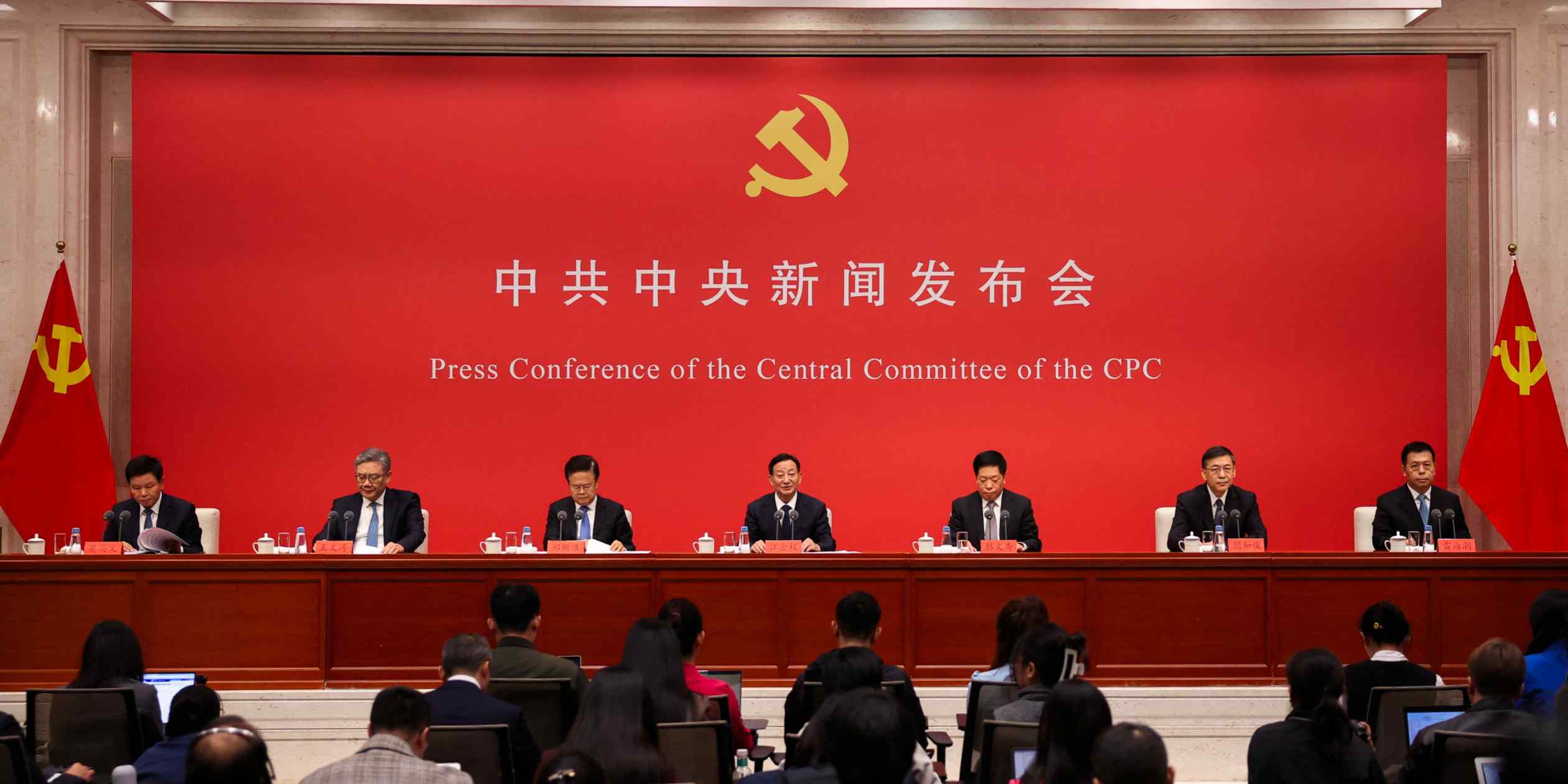 Chinese officials report on the outcome of the fourth plenum of the Chinese Communist Party Central Committee in Beijing on Oct. 24. © Reuters