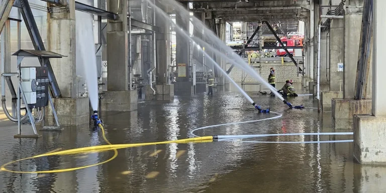 Firefighters blasting water onto pipes to prevent a secondary explosion, following the initial explosion and fire at the SK Energy refinery in Ulsan.Photo: Ulsan Fire Department