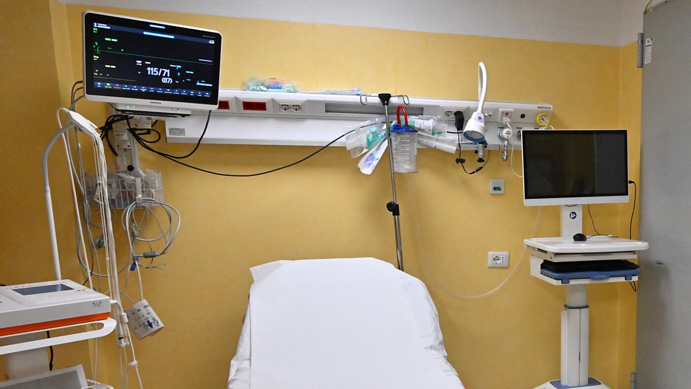 A picture shows a medical bed and a vital signs monitor for hospital patients.