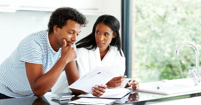 Couple has what appears to be a serious conversation over paperwork in the kitchen.
