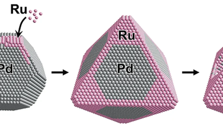 Deposition of ruthenium (pink) on a palladium nanocrystal seed (gray) followed by etching yields hollow ruthenium nanoframes.