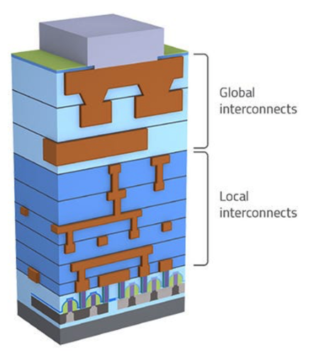 Fig. 1: Tightly packed local interconnections have the finest features while global interconnects are delayed less by RC. Source: Lam Research