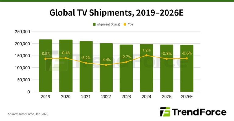 TrendForce has revised its 2026 global TV shipment forecast downward, from an earlier estimate of a 0.3% decrease to a 0.6% YoY decline, projecting 194.81 million units. Additionally, due to current cost structures no longer supporting the previous low-price strategies, retail price increases for new TV models are now considered unavoidable.