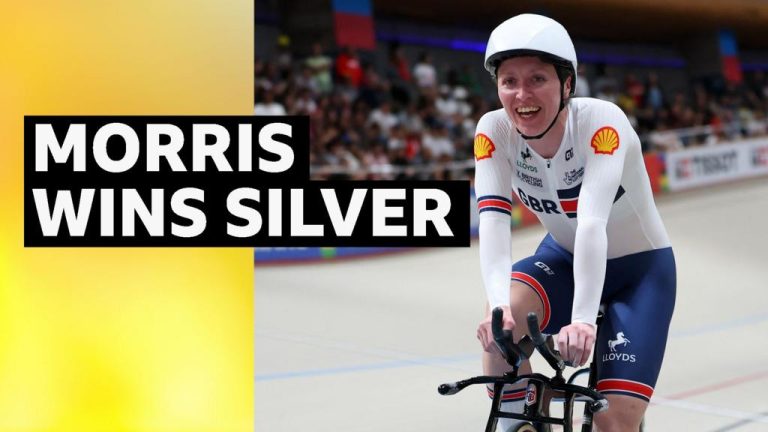 Great Britain’s Anna Morris leaps from sixth to second after the final sprint for the line to take silver in the women’s points race at the World Track Cycling Championships.