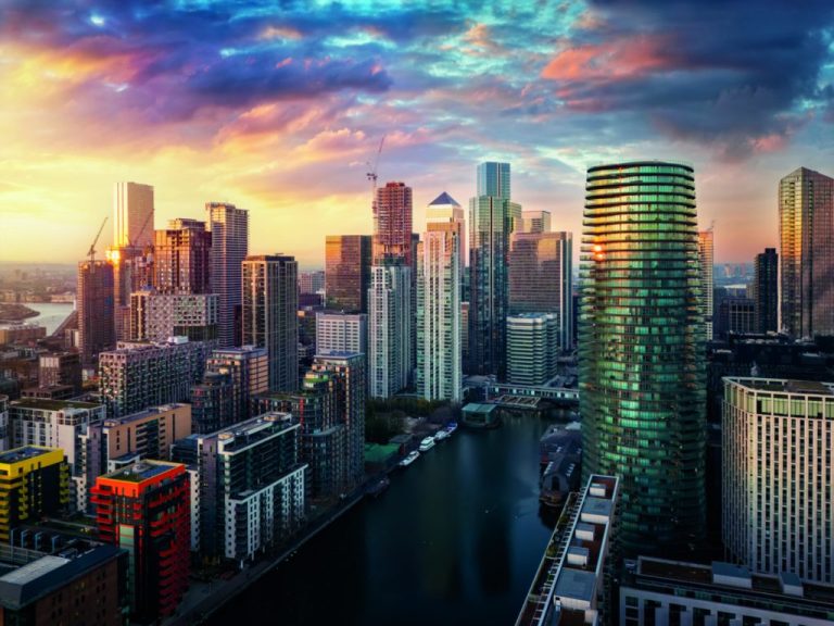 Panoramic sunset view of the residential and corporate skyscrapers at Canary Wharf and the Docklands, financial district of London, England